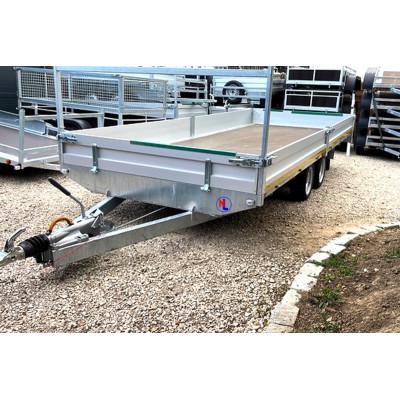 Cette remorque plateau à triple essieux, équipée d'un système de freinage est dotée de ridelles amovibles ainsi que d'un porte échelle inclus dans le tarif.